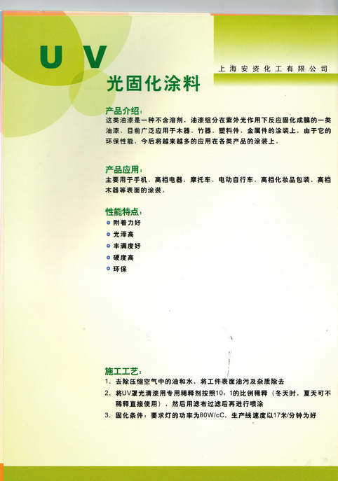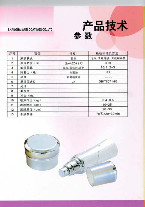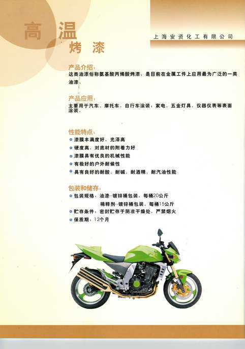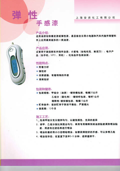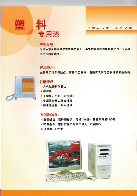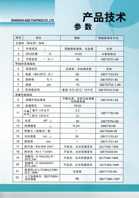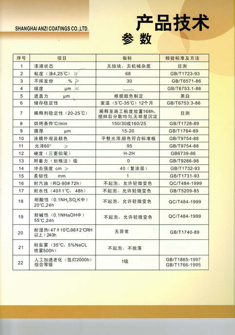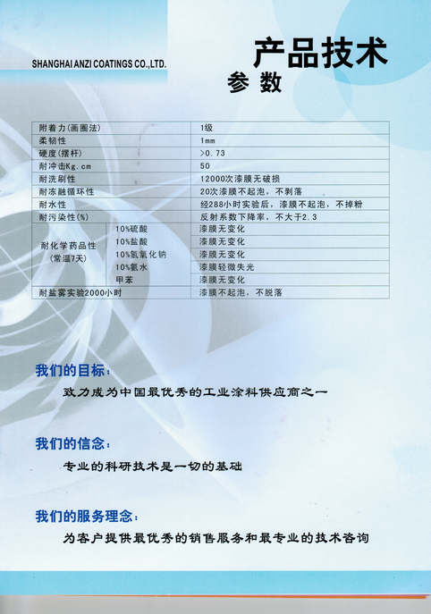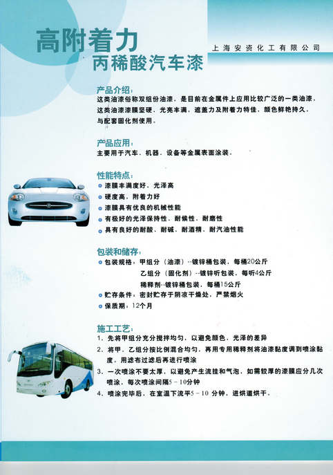 上海安資化工有限公司主要經(jīng)營(yíng)的產(chǎn)品有:汽車(chē)油漆、工業(yè)油漆、塑料專(zhuān)用油漆、高附著(zhù)力油漆、高性能汽車(chē)油漆、汽車(chē)內飾專(zhuān)用漆、金屬氟碳油漆、水性油漆、水性氟碳油漆及輔料。